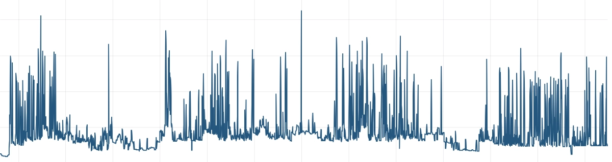 De hoge vermogenspieken van de torenkraan gedurende de werkdag.